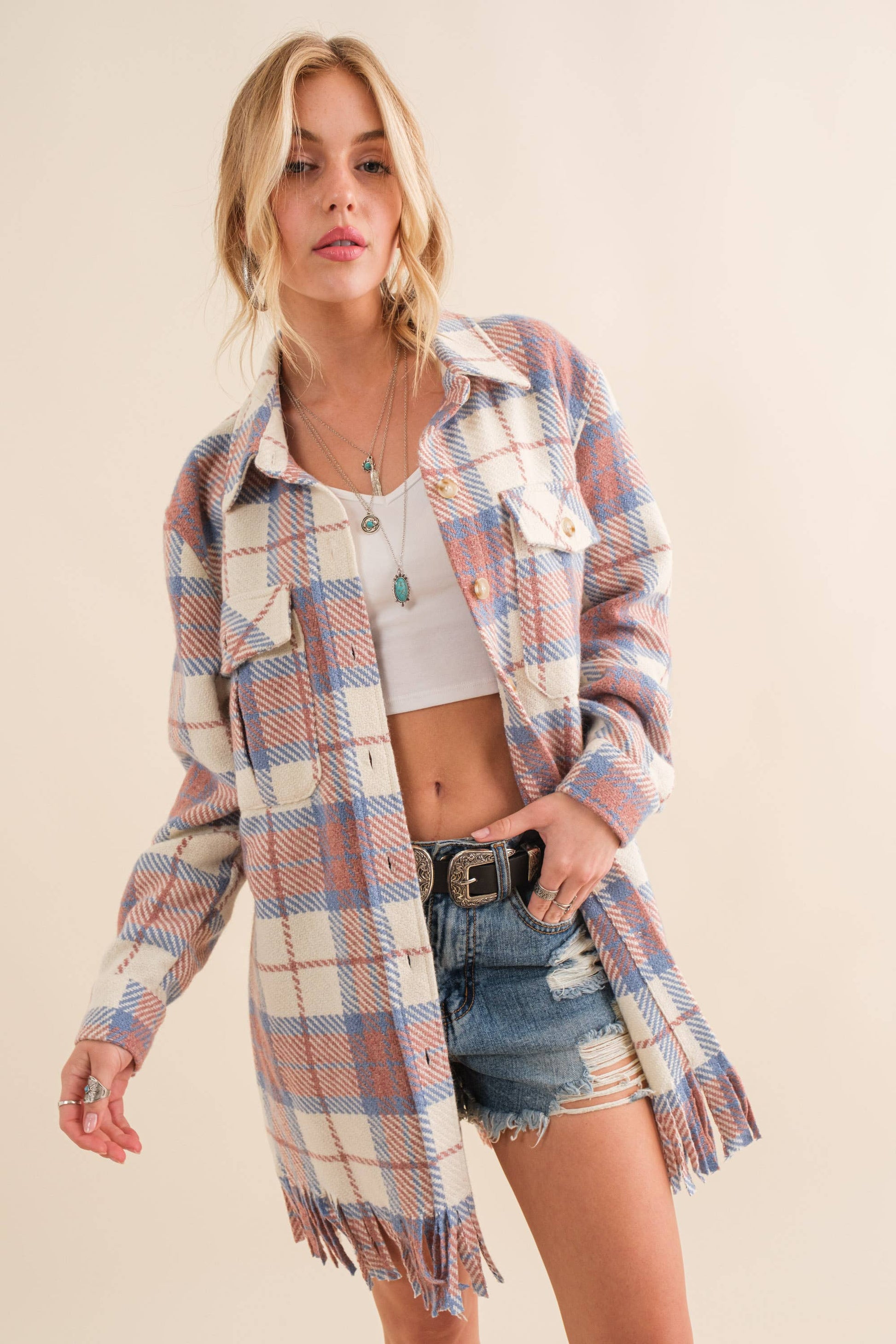 Yarn Dyed Fringe Bottom Button Up Long Shirt Jacket