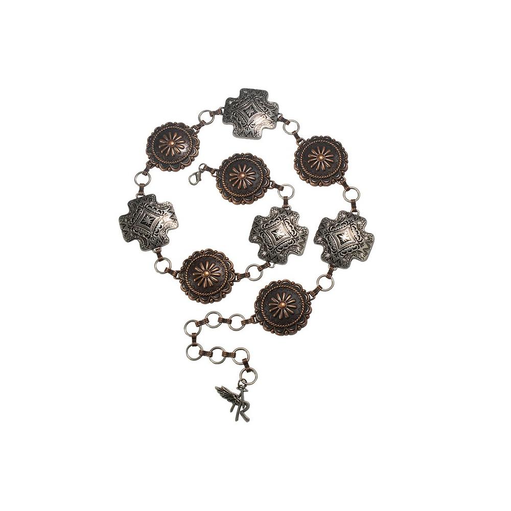 Angel Ranch Ladies chain belt by M&F Western Products. Scalloped round conchos in antique copper with raised engraved flower and a rope edge. Cross concho with southwest engraving in antique silver. The conchos alternate around the belt and has a lobster claw closure.