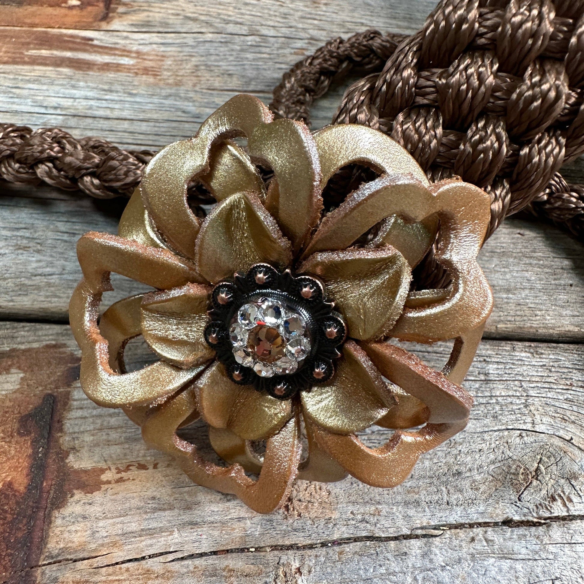 Favorite brown mule tape. Decorated with copper Champagne/Clear crystal conchos and gold leather lotuses. Mule tape is regular horse size with a 10ft lead.