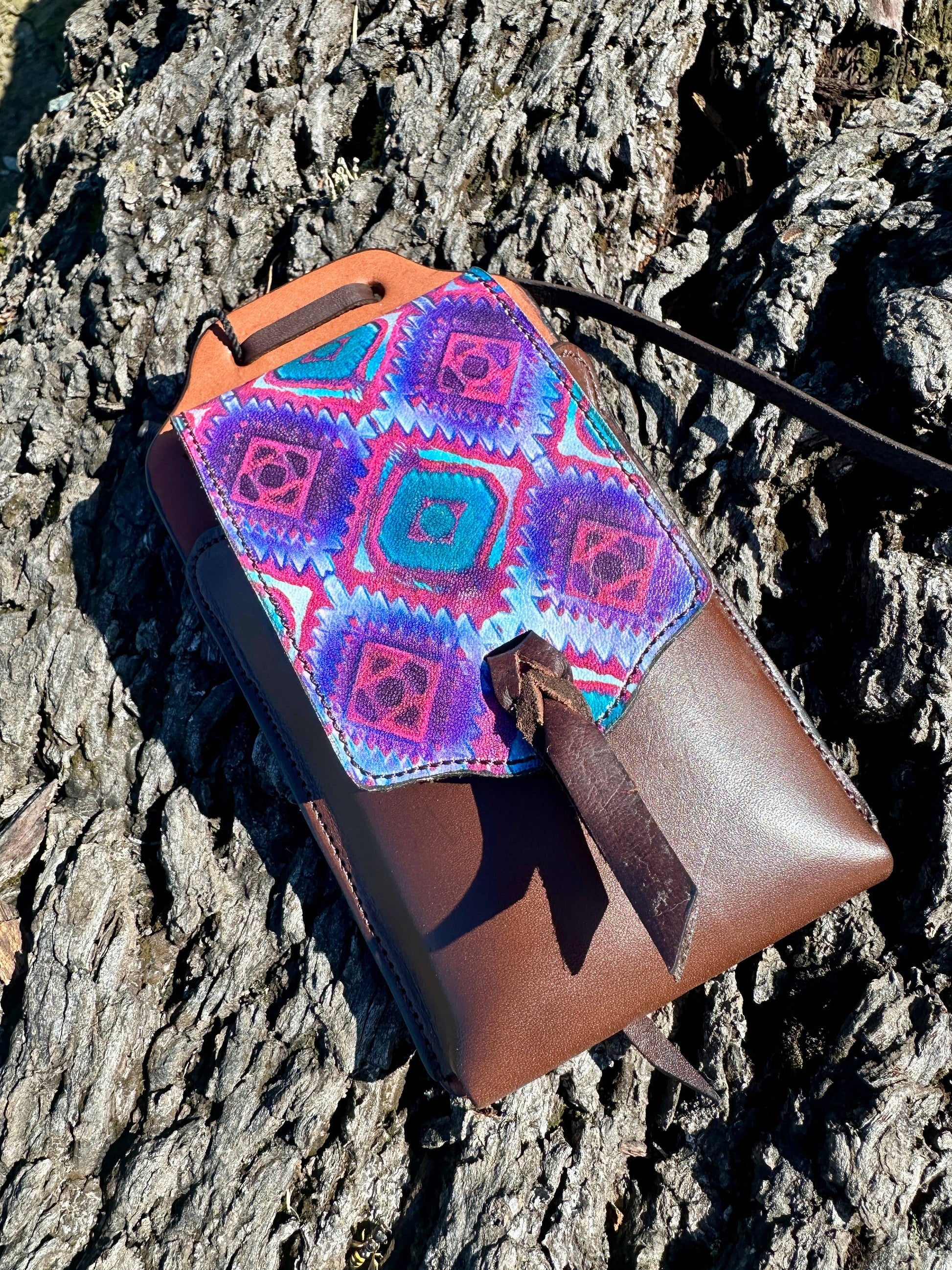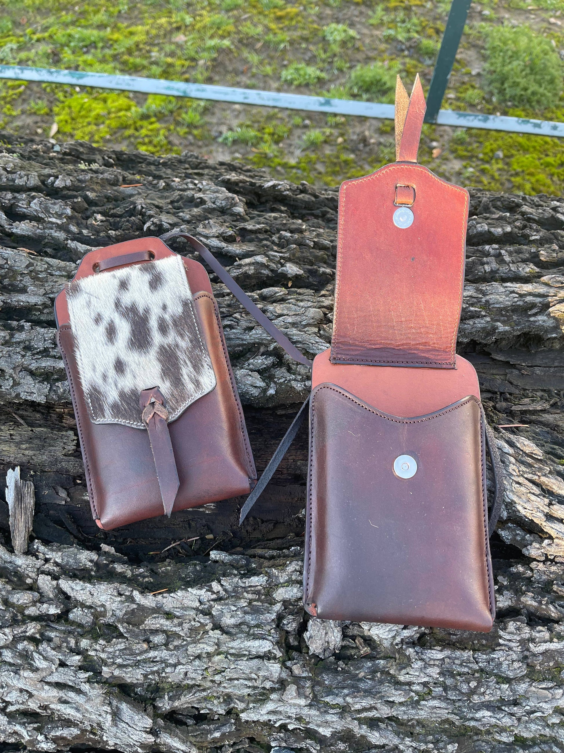 All leather back cinch cell phone holder with snap closure, big enough to fit IPhone max pro with decorative leather flap with tie detail. Back strap fits on thru a back cinch billet and the leather strings tie to the d ring