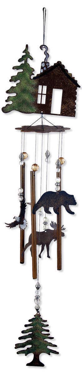 For the love of the woods, the Rustic Cabin Fever Wind Chime is really about fevering to getting back to the woods. This symbolic chime features icons of the great outdoors. Bear, Moose, Bald Eagle, log cabin & woodsy pines. These hand-crafted & painted metal silhouettes, accented with colored acrylic beads, dance in the breeze, powered by pine tree wind catcher. Simply hang your chime where the wind can reach it from as many directions as possible, then sit back and enjoy. Adds the perfect touch to your campsite, cabin, or Man Cave!