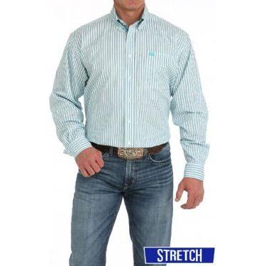 Performance in and out of the arena calls for a stretch friendly cotton-spandex plain weave like this handsome white striped button down by CINCH. Design features include contrast turquoise trim, an open left front pocket, embroidered logo, and white buttons.