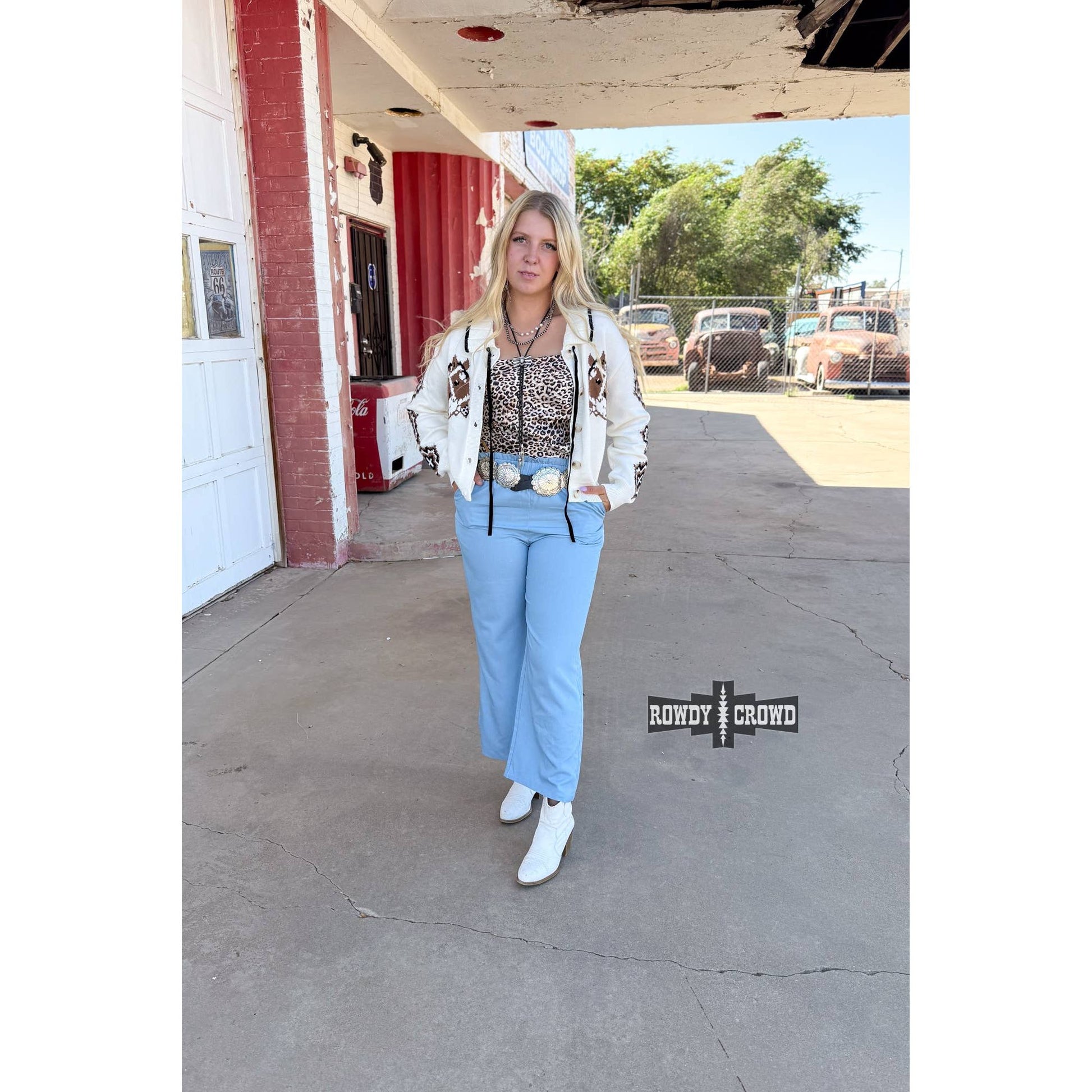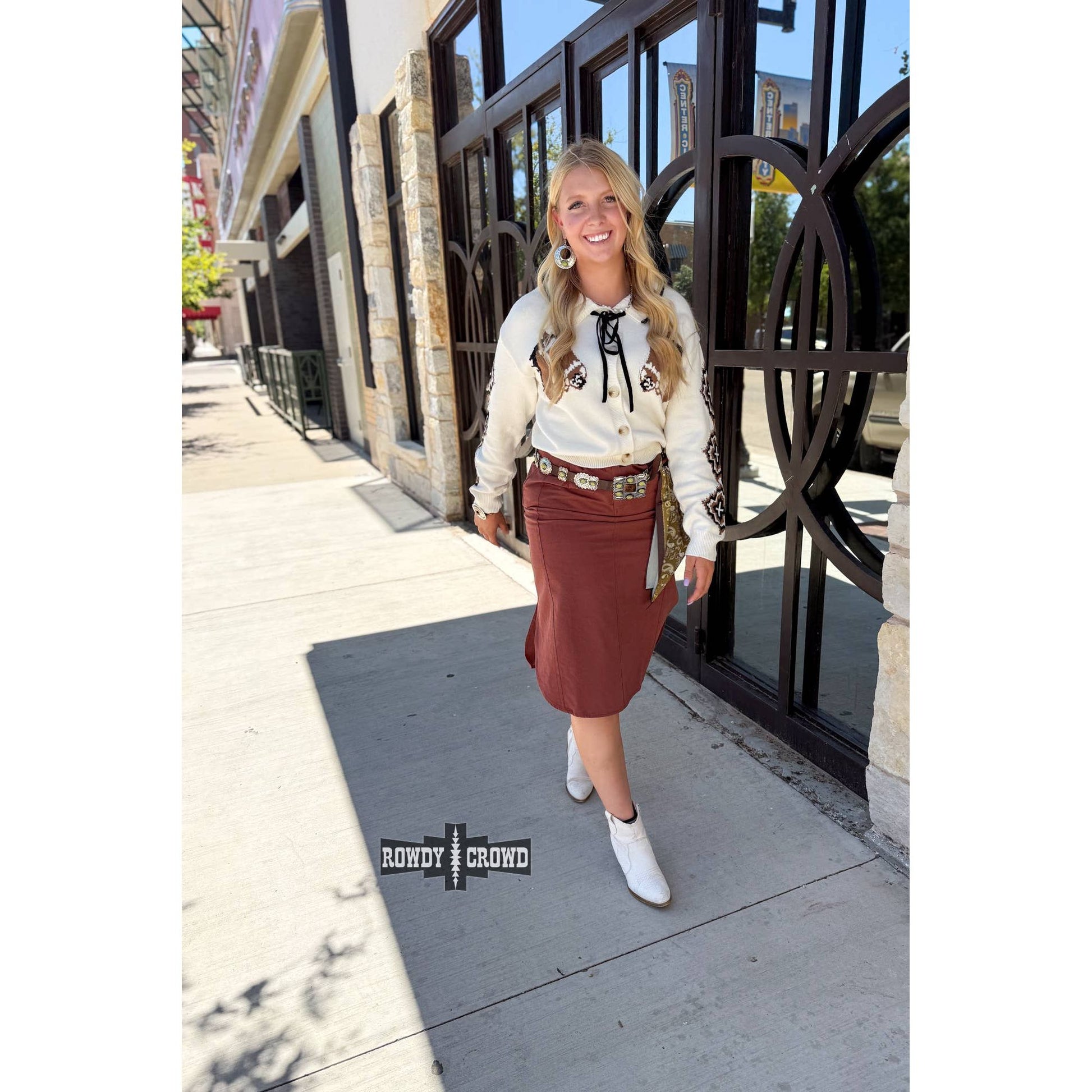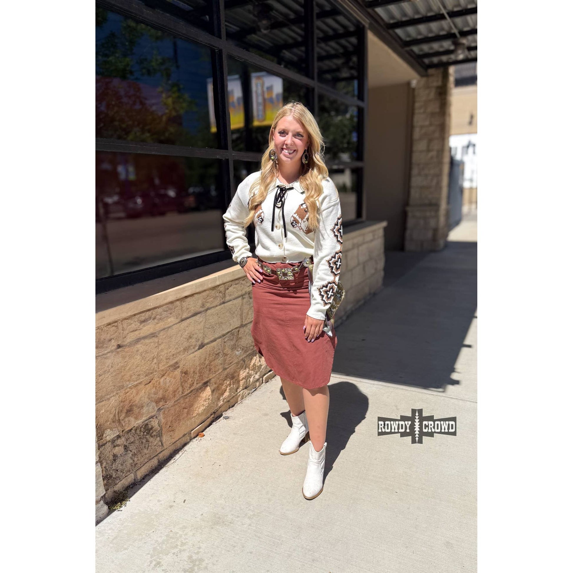 Soft and cozy knit meets Western flair in the Cool Horse Cardigan. Featuring two horses on the front and a neat collar trimmed in black, tied with a delicate bow at the neckline. Three bold Aztec patterns run down each sleeve for a subtle, stylish touch. Cozy, unique, and ready to elevate your look.