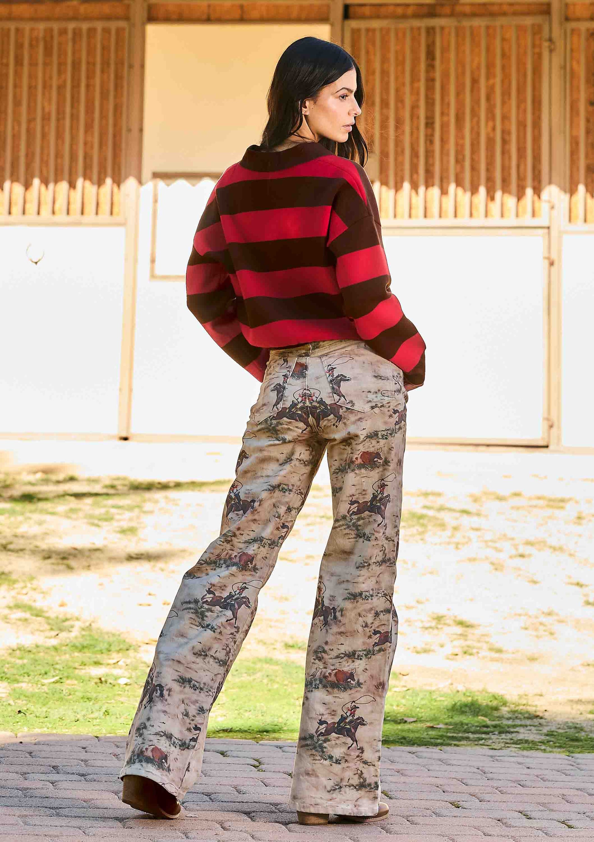 A pair of wide leg jeans featuring floral print, 5 pocket construction and zip-fly closure.