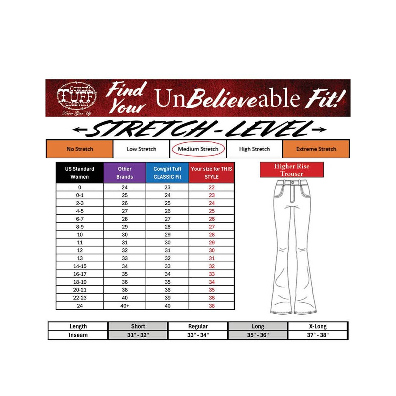 Check Out these New Trend Setting Boot Stitch Trousers! High Waist Fit Fans will love these classy dark washed big cuffed hemmed trousers that are finished off with a striking white overall stitching. Look at the sleek welt front pockets that aren’t those fashion pockets as they are 6 ½ deep! The back pockets are higher set, larger pockets with boot stitch embroidery. These are a mid-weight, Tuff Flex, medium stretch denim for that ultra comfortable fit. The plus is they are also very slenderizing. They are running true to size for a relaxed fit, go down a size for a snug fit. Our Trousers typically run long as they do not stack on boots, so we advise going up 1 length.