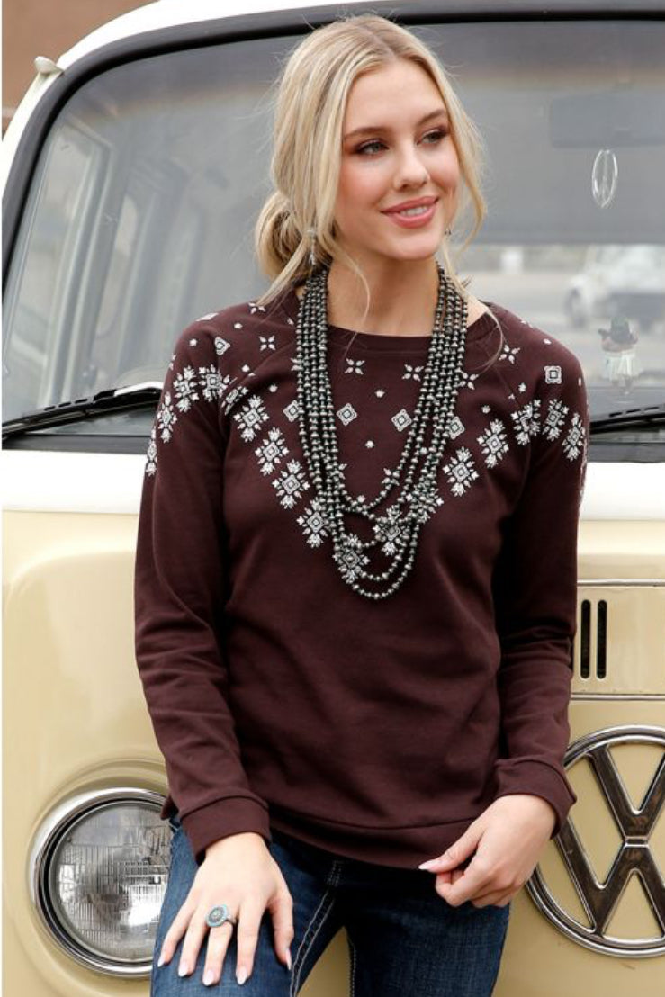 Look stunning from all angles in our heather brown raglan top with eye-catching front and back screen prints. Paired with new blue jeans and boots, this top's cotton/poly/rayon brushed French terry construction puts the comfort in cowgirl chic. Features Cruel Denim logo embroidery.