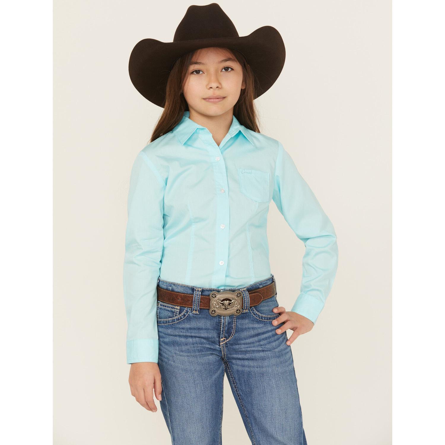 Girls Cruel Girl Shirt: Girls Cruel Girl Western Shirt. This girl’s western shirt from Cruel Girl is perfect for all the cowgirls. This solid turquoise shirt has Cruel Girl logo embroidery. This long sleeve shirt has a button front closure with white buttons. This shirt is made of plain weave cotton. CTW3120002
