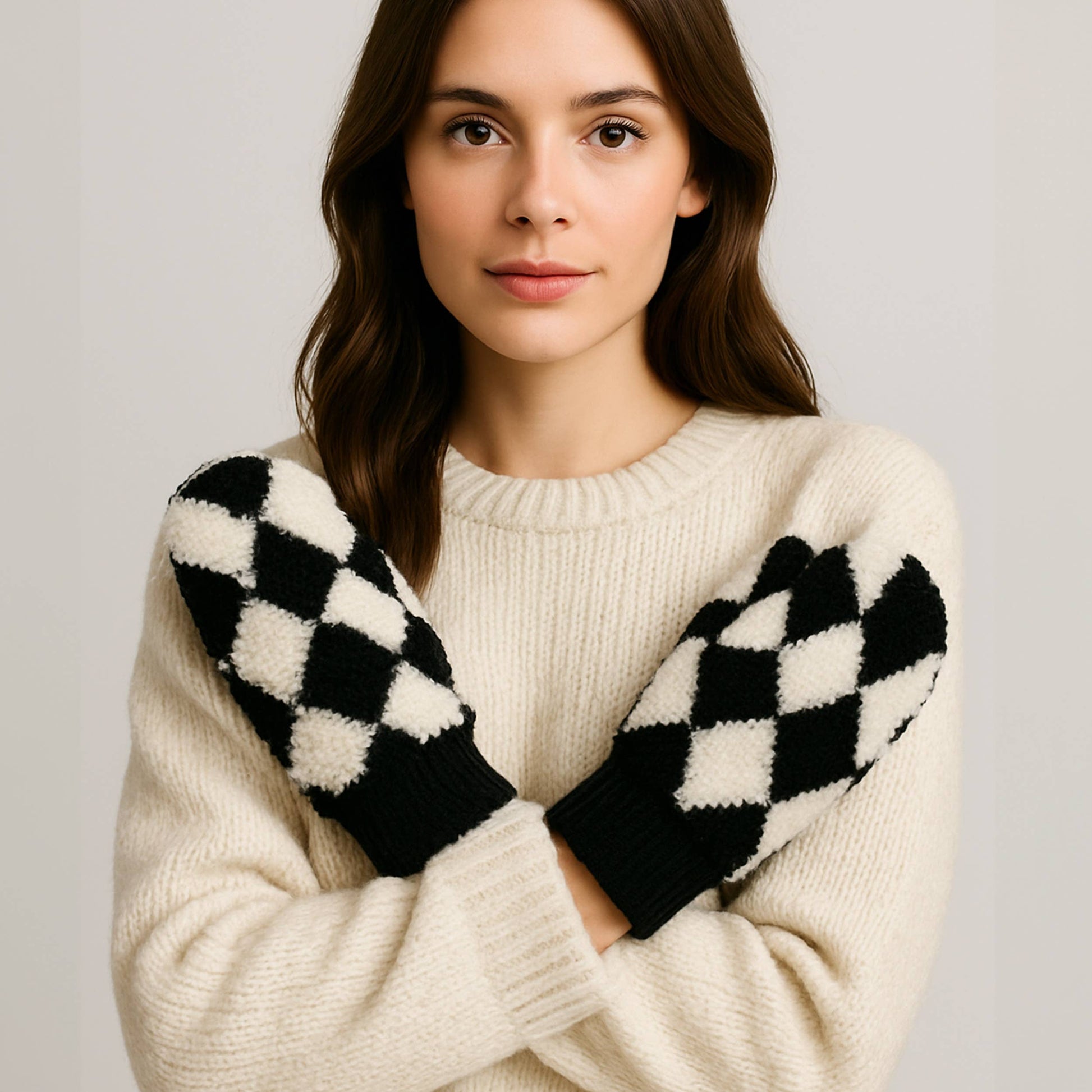 Two Tone Diamond Pattern Sherpa Warm Mittens Winter Gloves