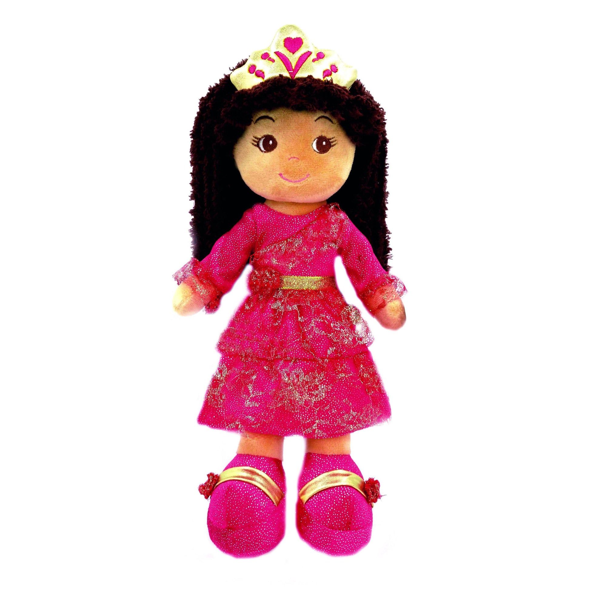 Lola is a beautiful tan skin princess doll with brown hair and brown embroidered eyes. This stunning baby doll is dressed in a dark pink sparkle dress with layers of gold lace ruffles, and matching shoes with rosette flowers. On her head, she wears a gold crown with dark pink embroidery that embellishes her long brown locks.