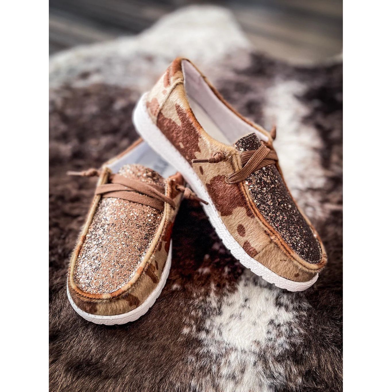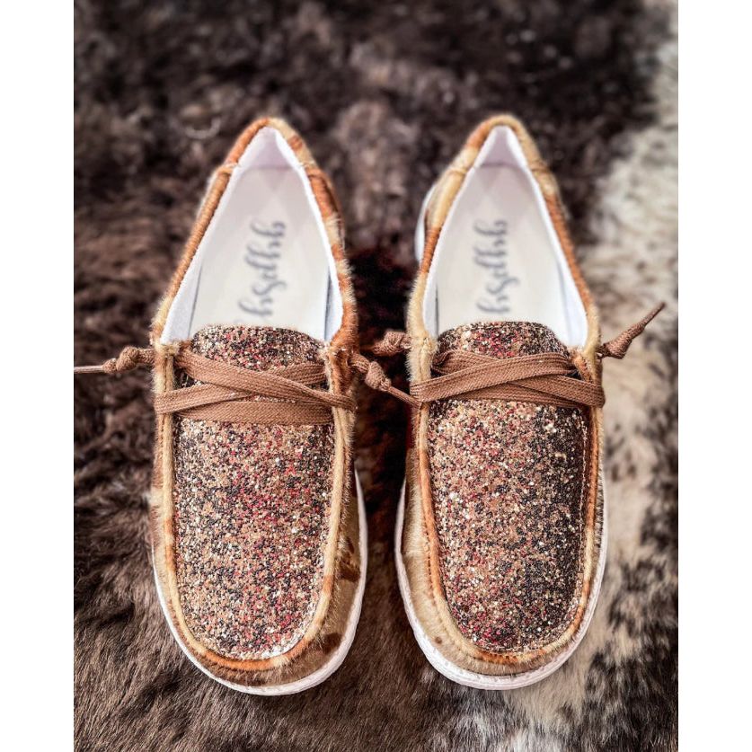 The Gypsy Jazz Brown Fifer Shoes are a stylish and sophisticated addition to any wardrobe. Made with premium cow hide print material and sparkly sequin detailing, these shoes offer a unique look with superior quality material. Elevate your shoe game with the Gypsy Jazz Brown Fifer Shoes. Made with high-quality cowhide print and dazzling sequins, these shoes add a touch of sophistication to any outfit. With materials like these, your feet will feel like royalty (but without the hefty price tag).