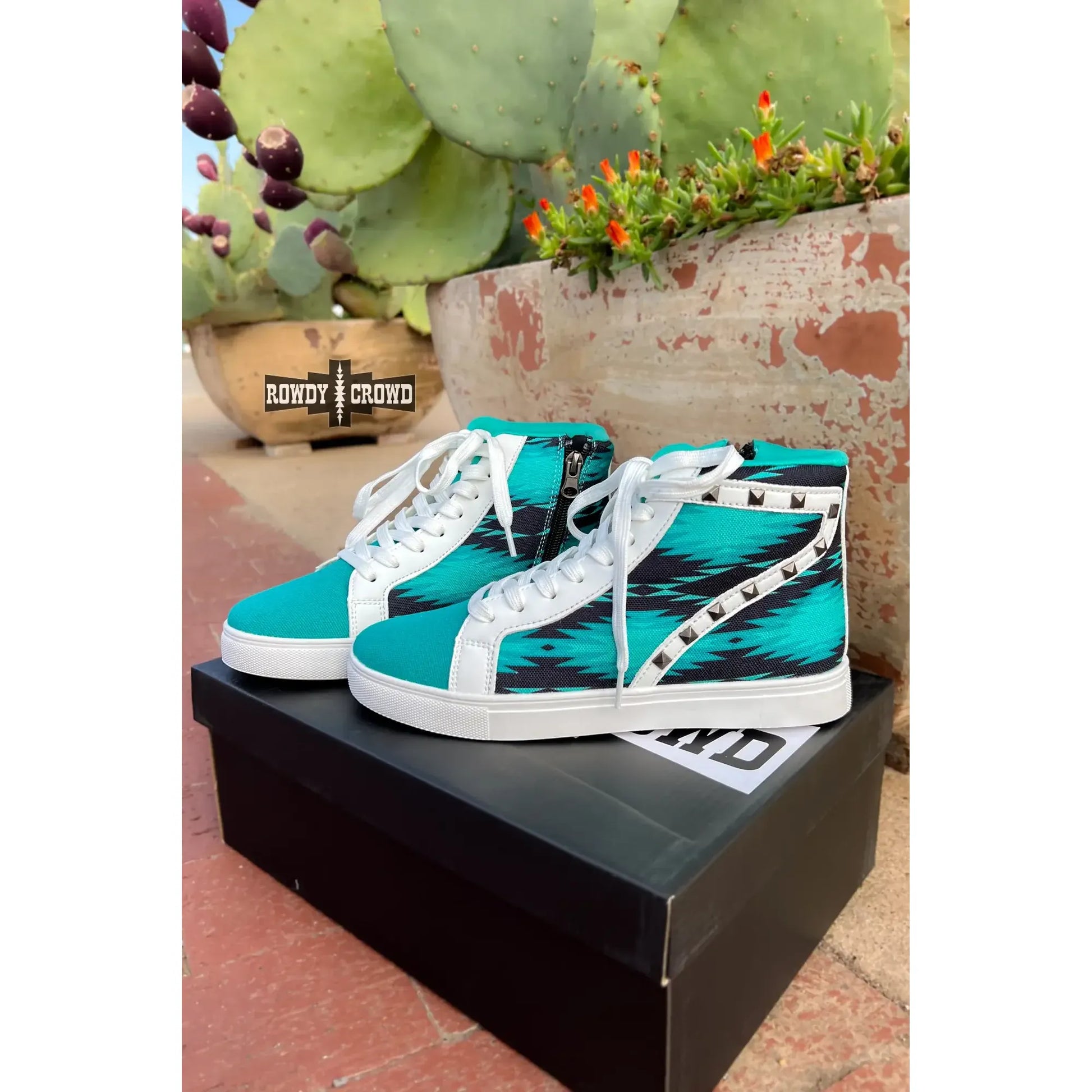 The Heartland Hightops put a spin on our favorite style sneaker. The black aztec print stands out on the turquoise detailing with highlights of white. The studs along the white give a little pop of extra shine. These hightops will be perfect for every outfit.