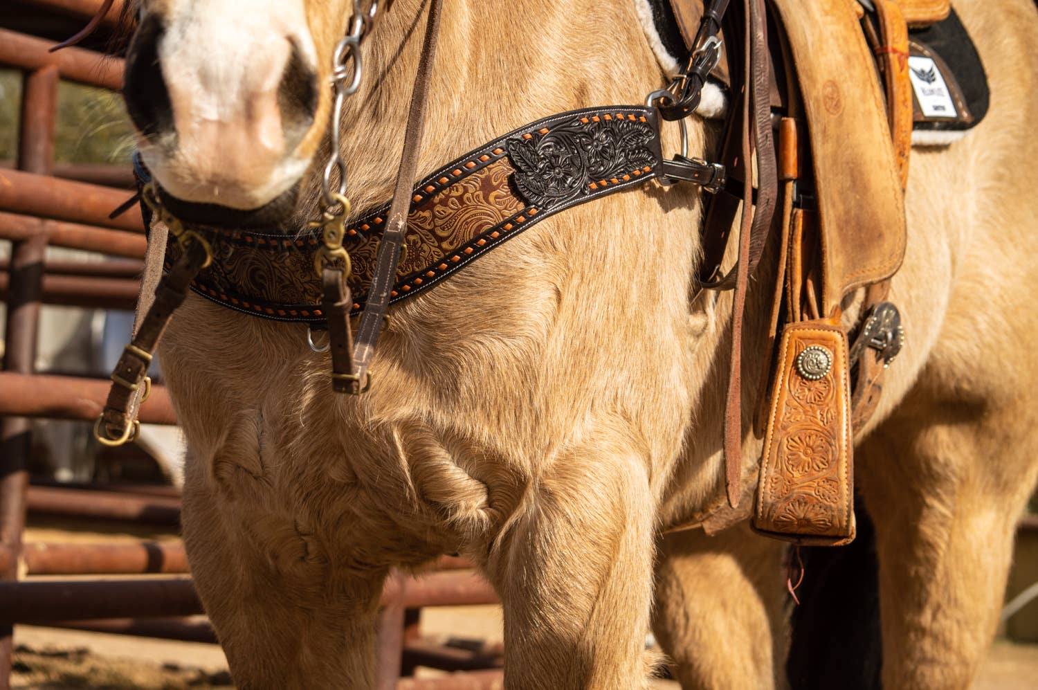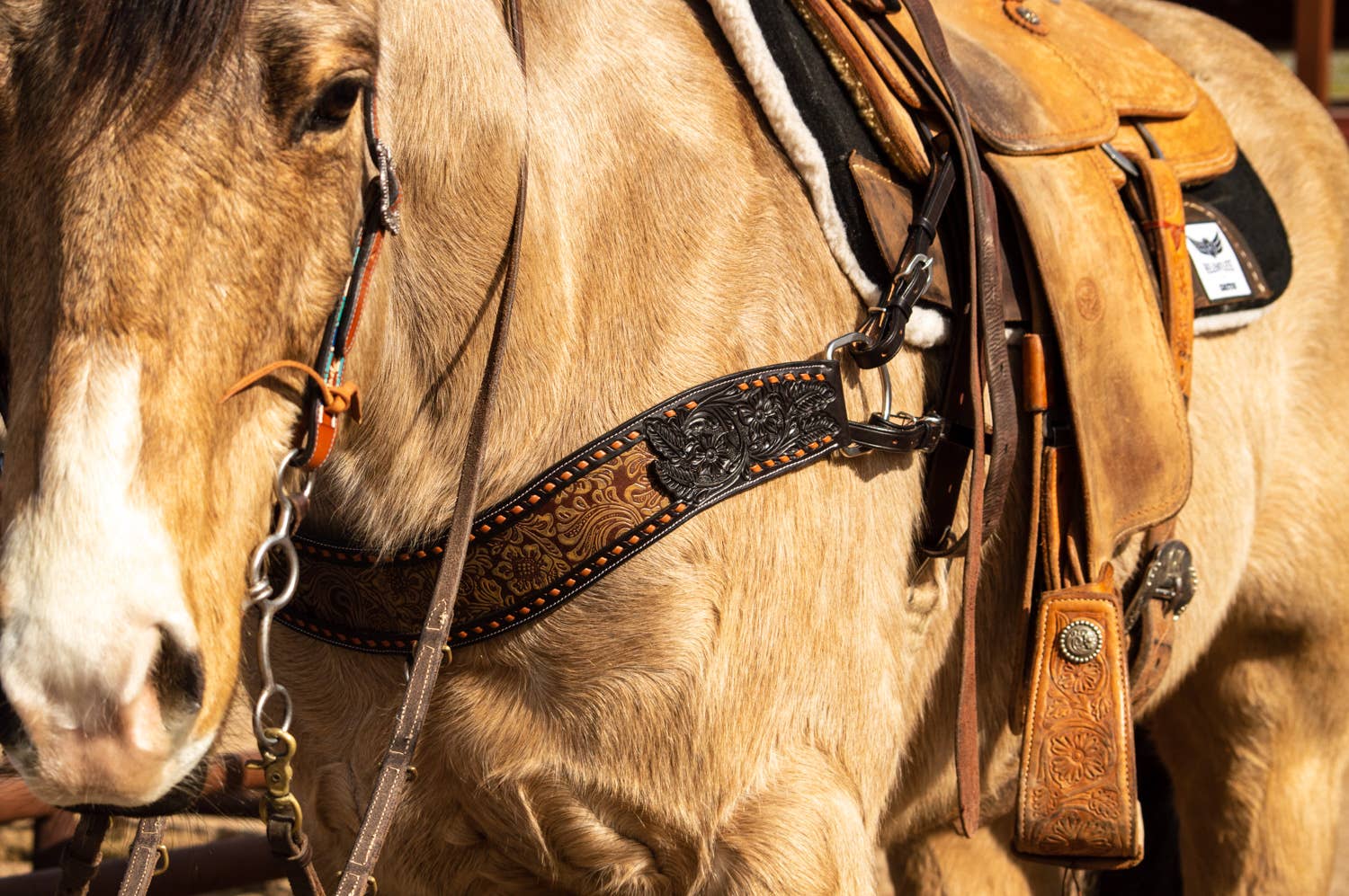 Dark leather tripping collar featuring floral print leather inlay, tan buck stitch and floral tooling accents. Tripping collar is 4" wide and has double tugs.