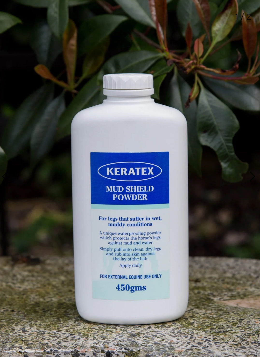 Keratex Mud Shield Powder is a highly-acclaimed, handy, easy-to-use powder which you puff onto horse’s legs for a cleansing and waterproofing action on legs which are prone to scabs and broken skin in wet and muddy conditions. This light talc will give your horse’s legs a breathable, resilient coat of powder that does not absorb water (and therefore does not become sticky). It also works by making the leg hair so silky that mud cannot grip on to hair or soften the skin underneath. Further to this it will assist the horse’s natural defences against anything from mud and environmental water (such as muddy puddles and boggy fields) that might get into breaks in the skin and cause problems. This respected product is widely recognised by the equestrian community as a leader in its field.