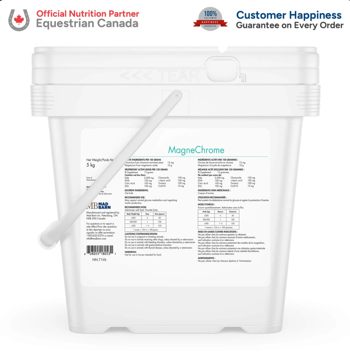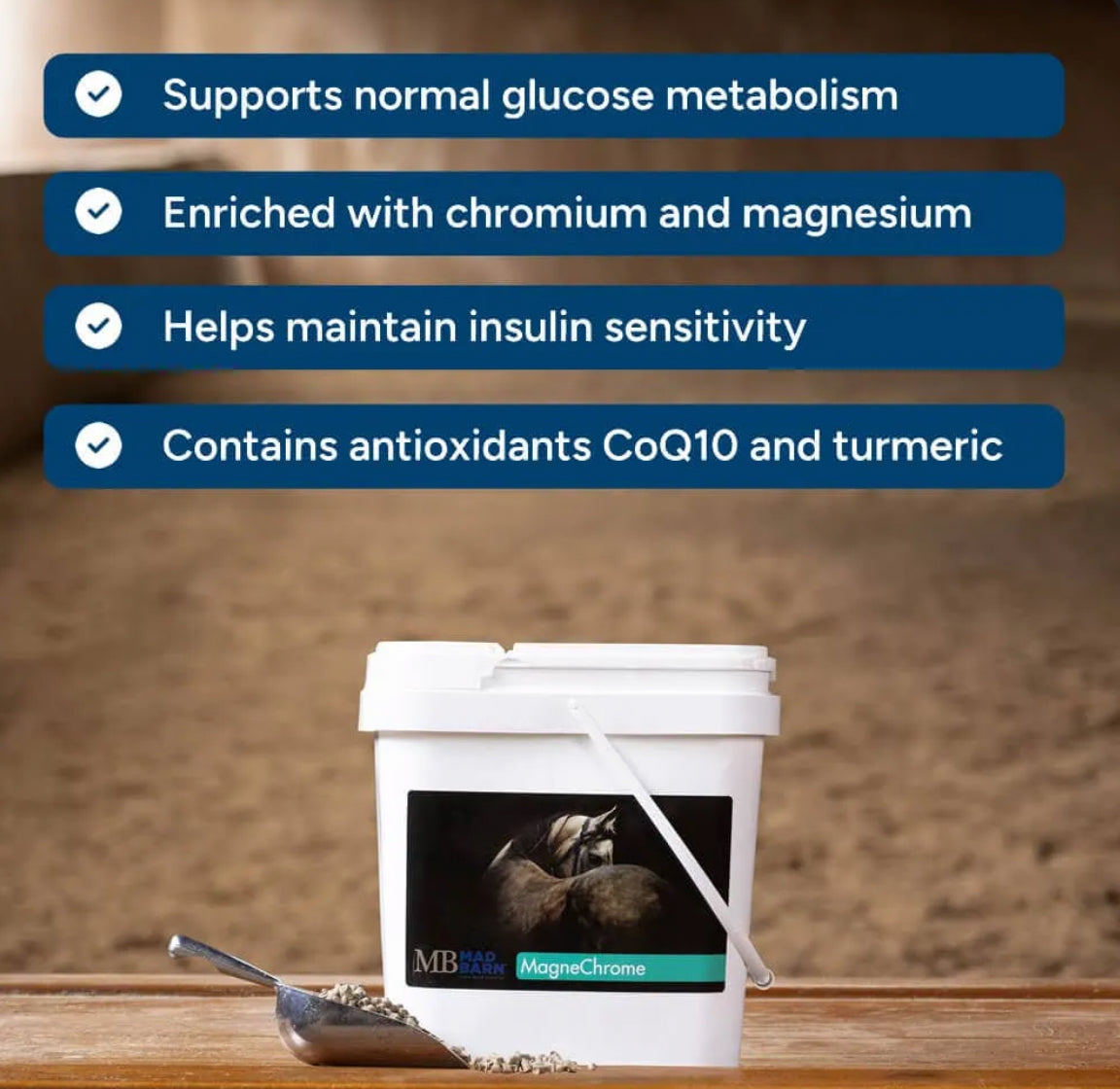 MagneChrome is a pelleted supplement formulated to support glucose metabolism and insulin sensitivity in horses with metabolic syndrome, laminitis, and Cushing’s (PPID). With a combination of chromium yeast, magnesium, turmeric, CoQ10 and more, MagneChrome helps to maintain antioxidant defenses and normal regulation of inflammation.