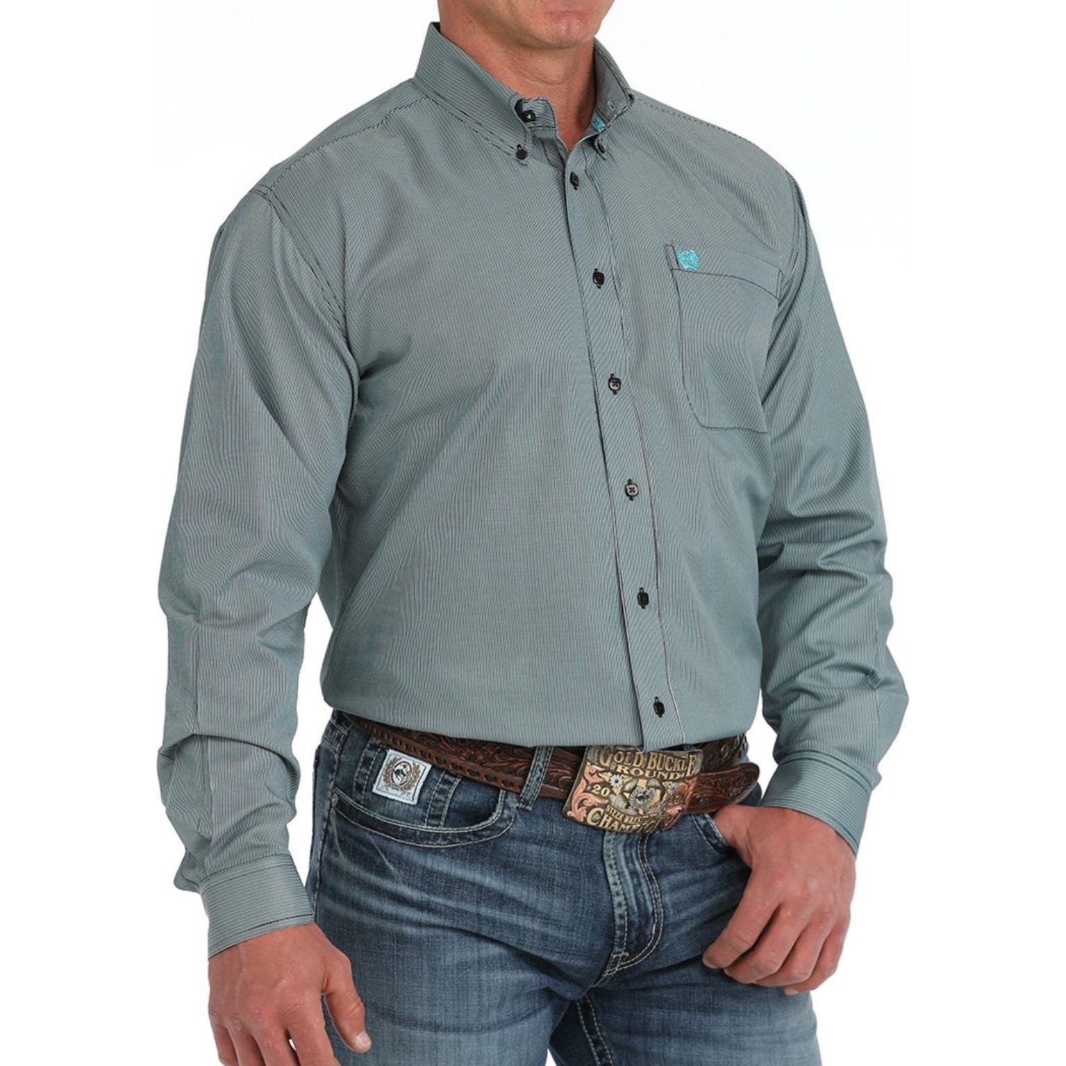 Constructed in black striped poly/Tencel/cotton twill weave, this head-turning shirt by CINCH is made for the outdoors. Keep comfortable on the job site or in the saddle wearing this performance option that features an open left front pocket, embroidered logo, and black square buttons