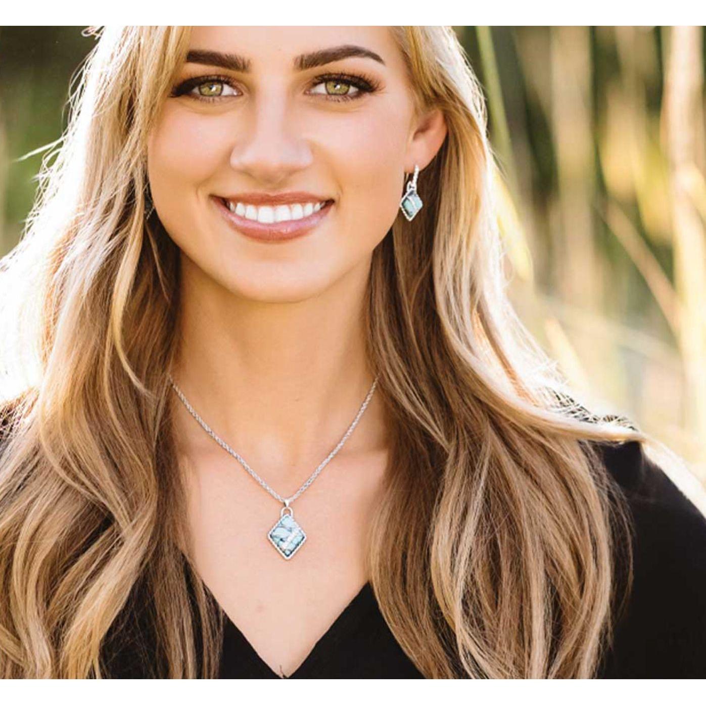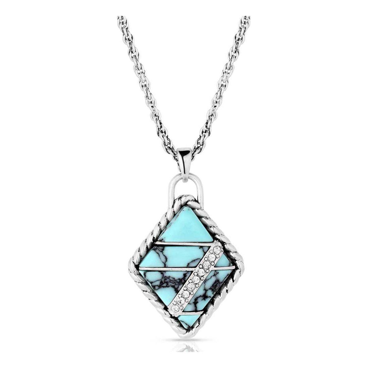 Add a hint of turquoise to your outfit with the High Noon Cobblestone Necklace. This pendant necklace is the perfect piece to layer with other necklaces or wear on its own. The diamond shaped pendant is a silver tone with a twisted rope border. Pieces of turquoise sit on the inside. Adding sparkle is a diagonal line of clear cubic zirconia crystals through the center giving the design a unique look. The pendant is secured by an adjustable 19 inch chain.