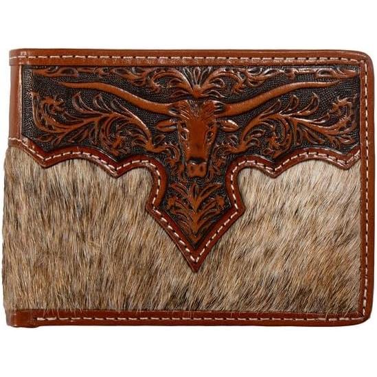 Mens Nocona Wallet: This Nocona bifold wallet with removeable passcase by M&F Western Products is genuine leather. It features a brown calf hair body with an embossed longhorn overlay. Multiple card slots, cash slot, and ID window on the inside. 100% leather. Hair on hide is a natural product and will wear under normal conditions. Each product may vary slightly in shading, hair length and color making each item a unique product. This product comes in assorted colors only and specific color requests cannot be accommodated. N500048302