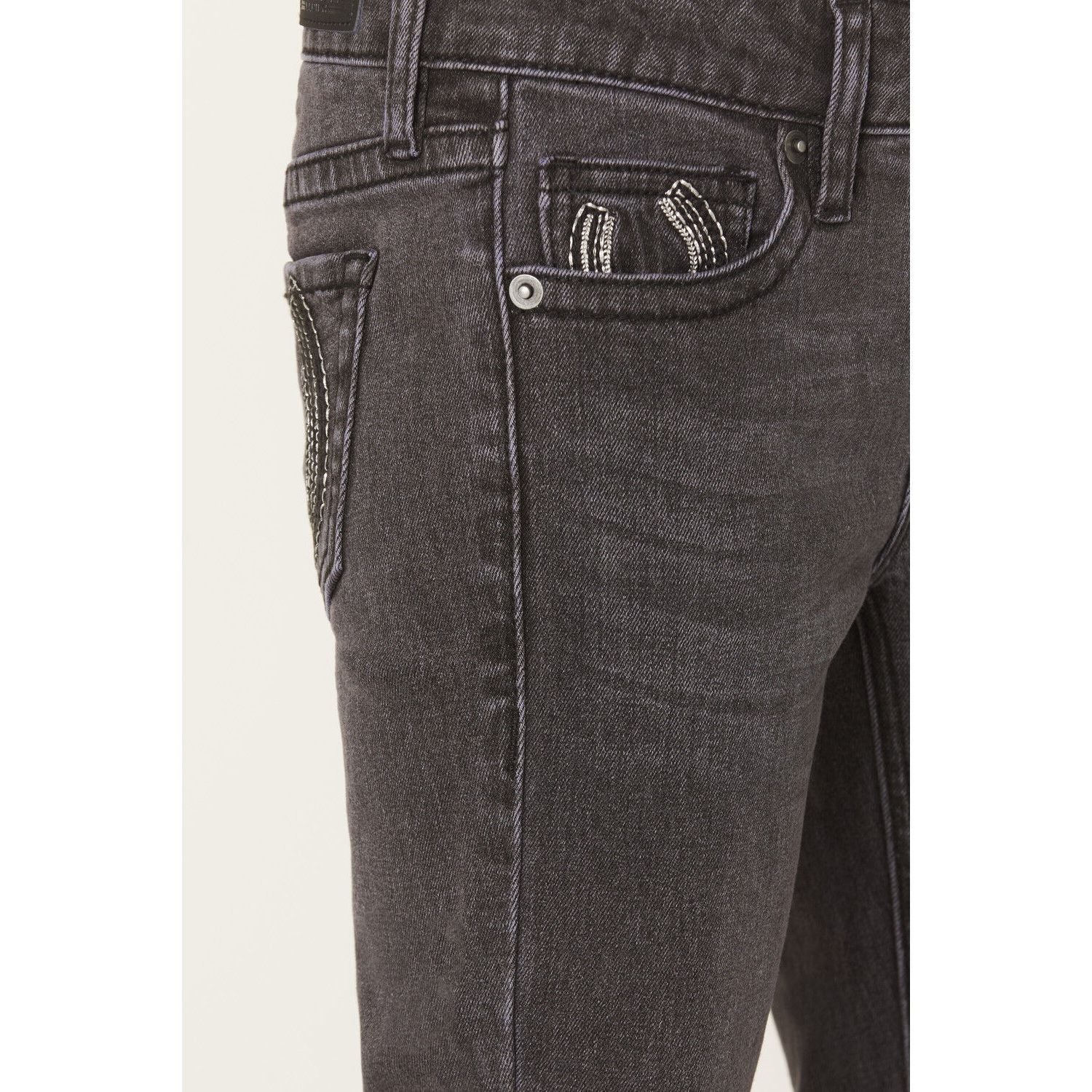 - Horseshoe embroidery on back pockets and coin pocket