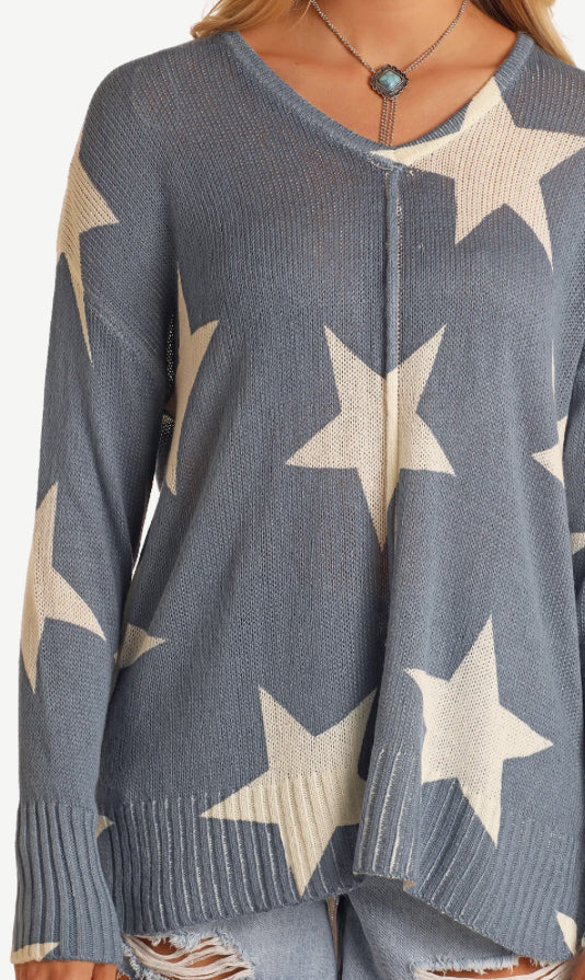 Rock & Roll Cowgirl Lightweight Star Sweater in blue Lightweight sweater in coral with white star pattern. Designed in the USA. Made in China 100% acrylic Hand wash cold. Do not bleach. Do not wring or twist. Hang dry, drip dry, or dry flat. Wash dark colors separately.