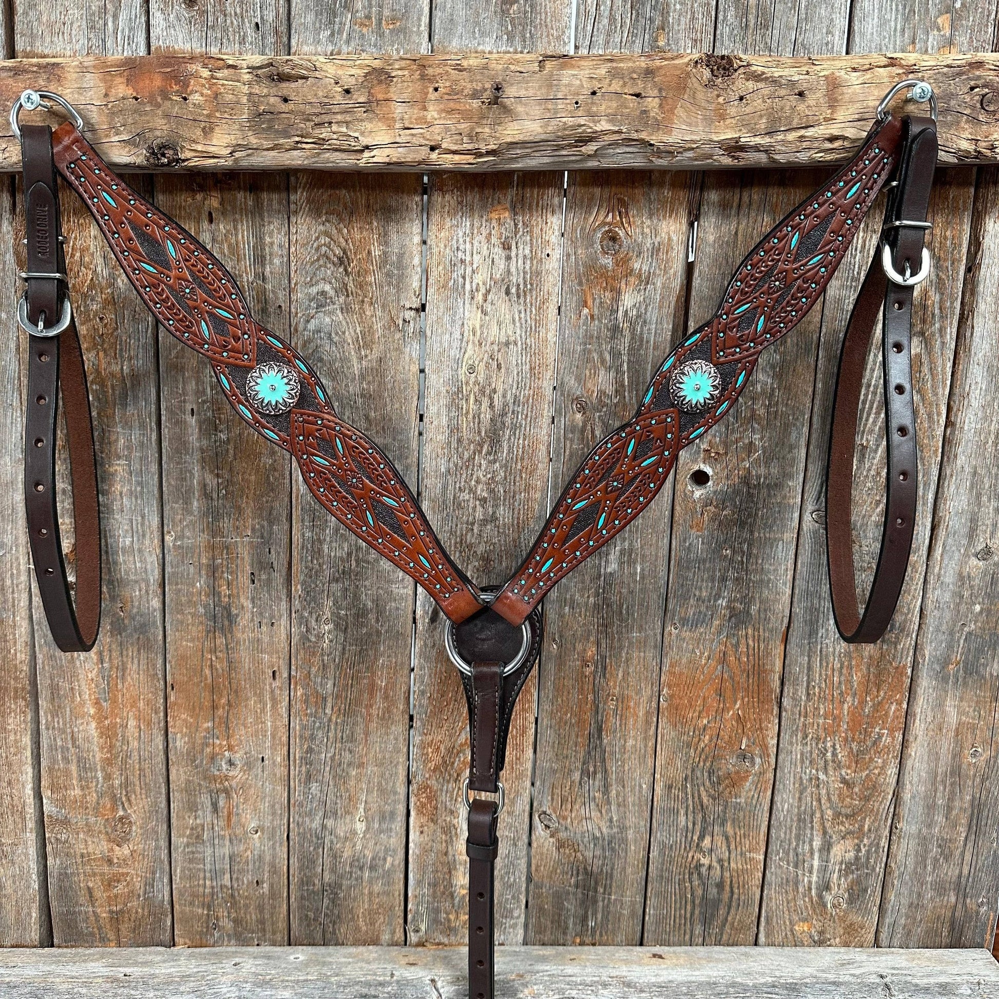 Browband, one ear and breast collar is dark oil with turquoise hand painted accents style. They are decorated with copper and antique silver flower with turquoise enamel western concho (W122L). Full Horse size Measurements Headstall measurements : bit to bit - 36" shortest setting : 44" longest setting Browband measures 15" across Breast collar measurements - From Center Ring to D Ring -16"Breastcollar including toggles : shortest settings - 26" : Longest settings -29"