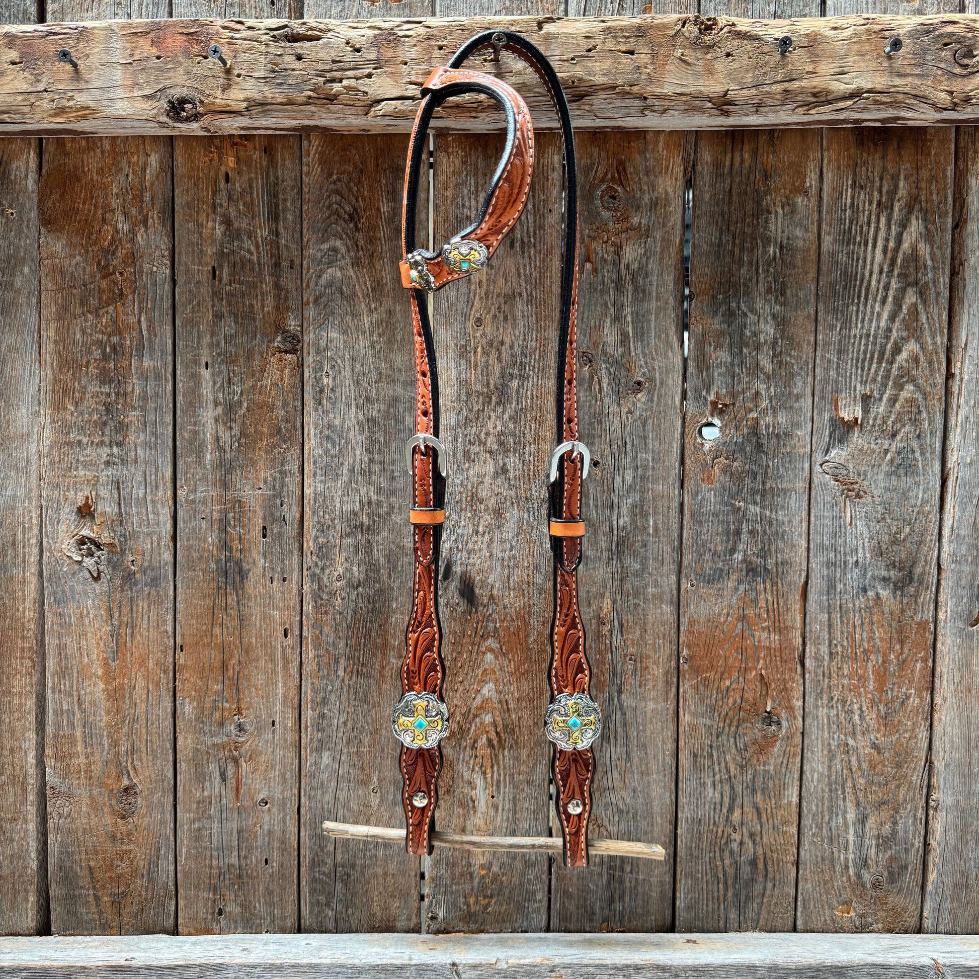 Browband, one Ear and breast collar is light oil floral scalloped style. They are decorated with antique silver with gold cross and turquoise colored stone western conchos (W189). Full Horse size Measurements Headstall measurements : bit to bit - 36" shortest setting : 44" longest setting Browband measures 15" across Breast collar measurements - From Center Ring to D Ring -16"Breastcollar including toggles : shortest settings - 26" : Longest settings -29"