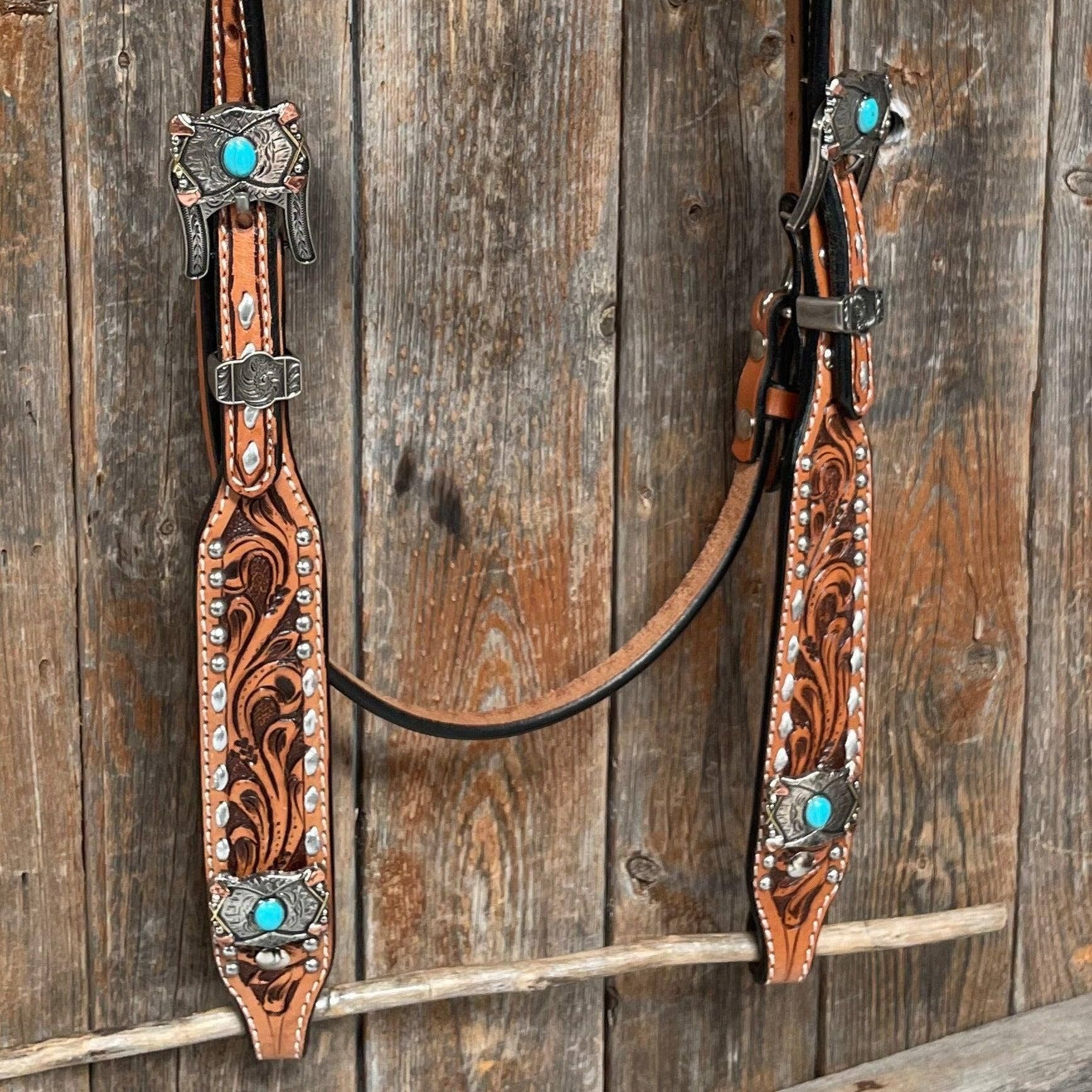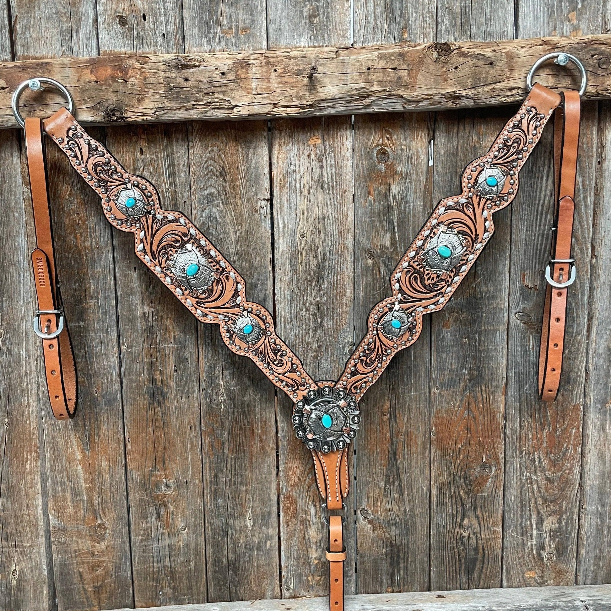 Browband, one ear and breast collar is light oil floral tooling, with a buck stitch style. They are decorated with antique silver turquoise and copper western conchos and buckles (W115). Full Horse size Measurements Headstall measurements : bit to bit - 36" shortest setting : 44" longest setting Browband measures 15" across Breast collar measurements - From Center Ring to D Ring -16"Breastcollar including toggles : shortest settings - 26" : Longest settings -29" B