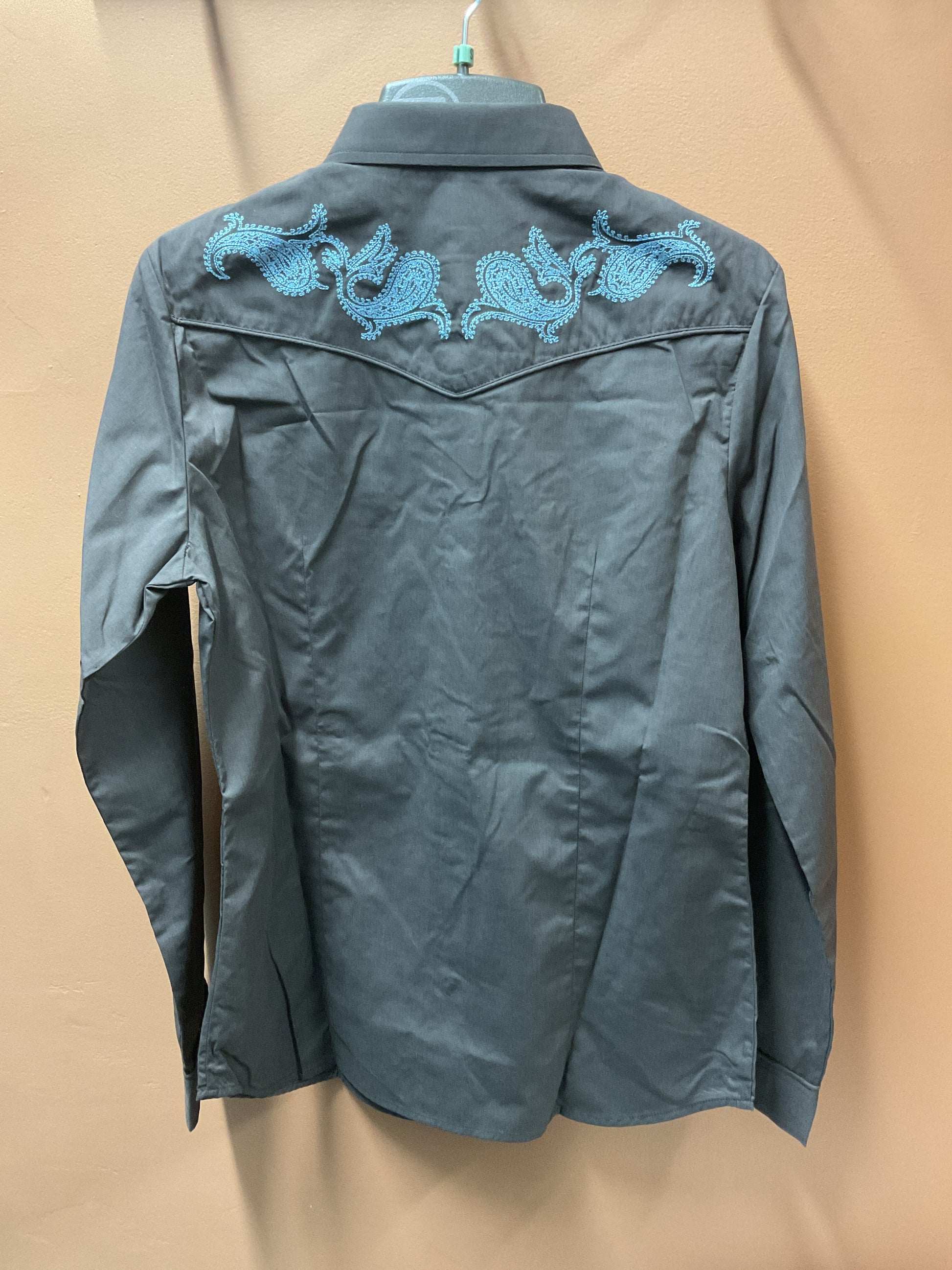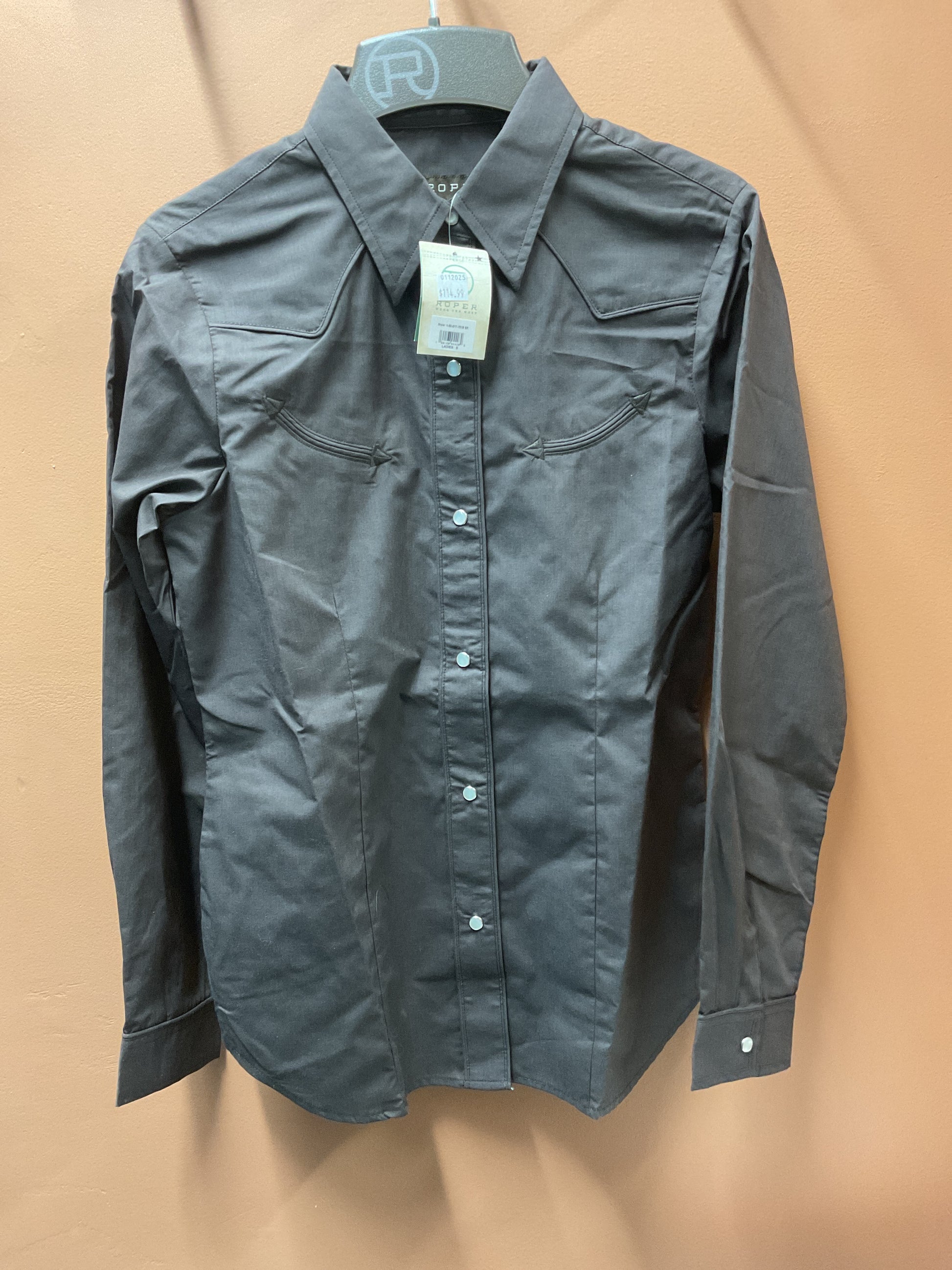For authentic, classic, western apparel, Roper is the brand to trust. This poplin blouse features cotton blend, faux smile pockets, snap button front. Layer up in this versatile long sleeve shirt.