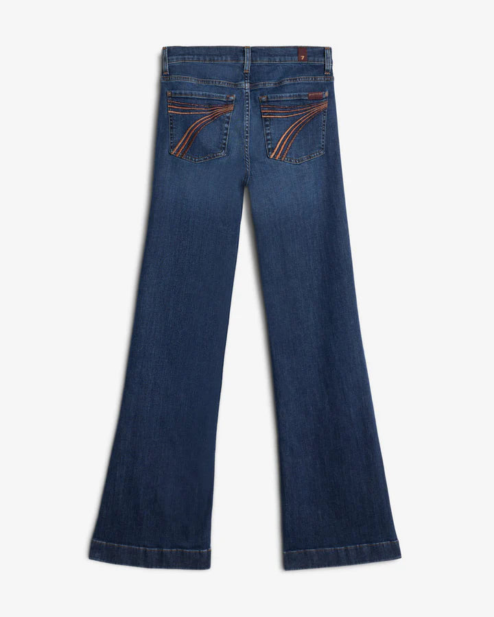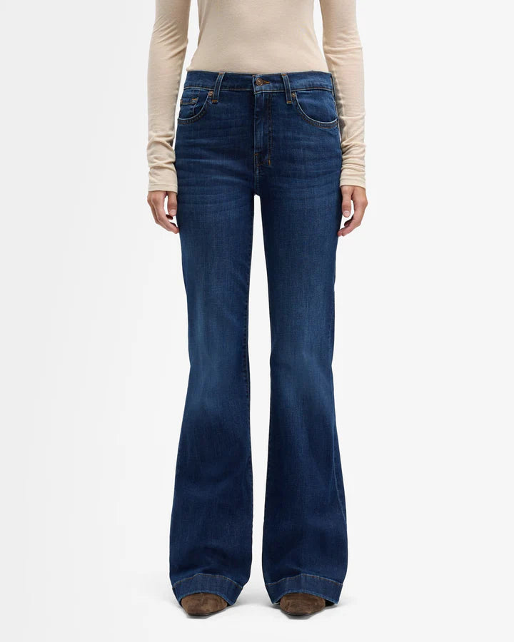 Fits like: Fitted through the hips and thighs. This mid rise denim has a wide, full-length leg and a subtle flare for a long, lean silhouette.