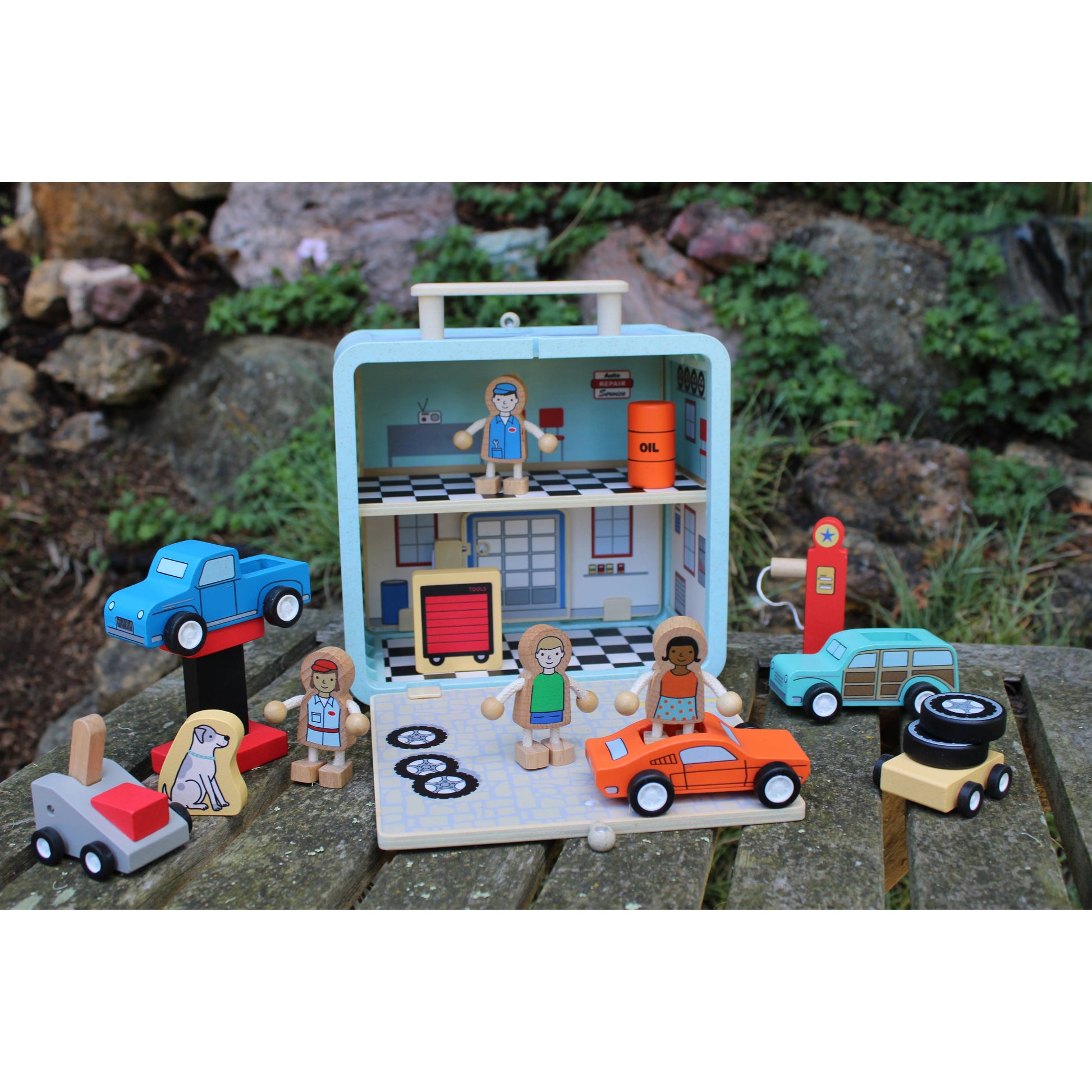 Our Suitcase Series encourages portable play and imagination-on-the-go. Each wooden suitcase opens up to a world of fun. The 16-piece Auto Repair Shop has everything you need for hours of fun, including cars, lift, retro gas pump, customers, mechanics, and more!