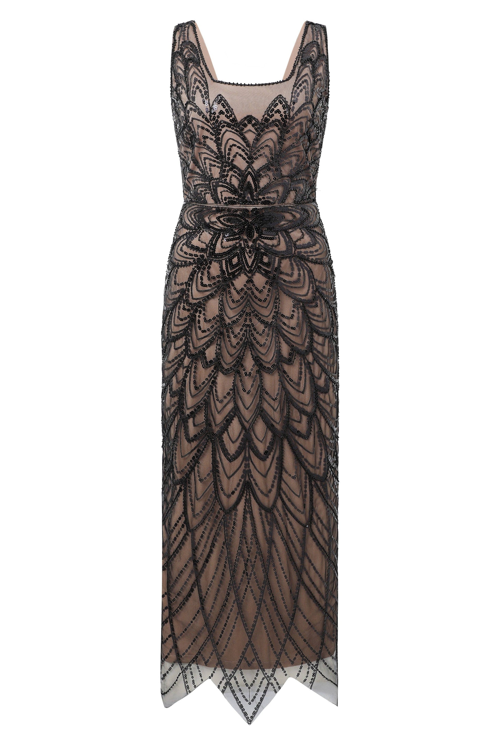 This gown features a radiating waistline design, where the delicate sequin work fans outward from the waist, creating a visually slimming effect that accentuates your natural curves. The symmetrical floral sequin pattern is intricately crafted, offering both elegance and sophistication, while the nude lining contrasts beautifully with the black sequins, creating a striking see-through body effect without compromising modesty.