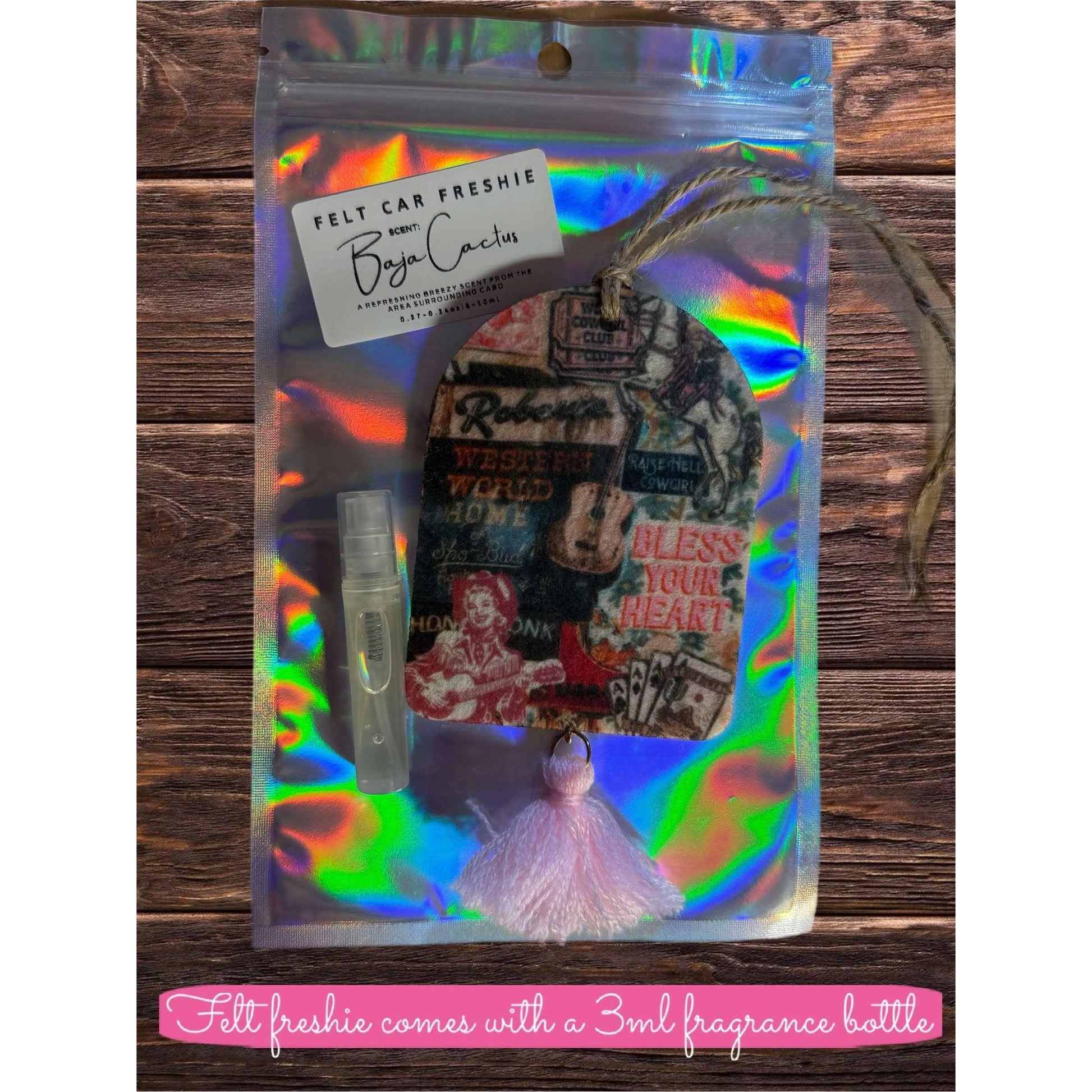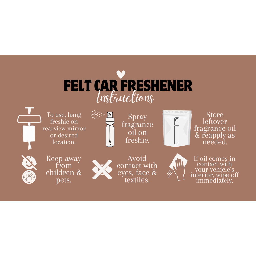 Each of our felt car fresheners come with a 3ml fragrance bottle with the scent of your choosing. Your customers can spray the freshener as needed with as much of the spray as they would like. Each item is packaged in a clear resealable package with a hole up top for hanging. It also comes labeled with the scent of your choosing with a brief description of the scent.