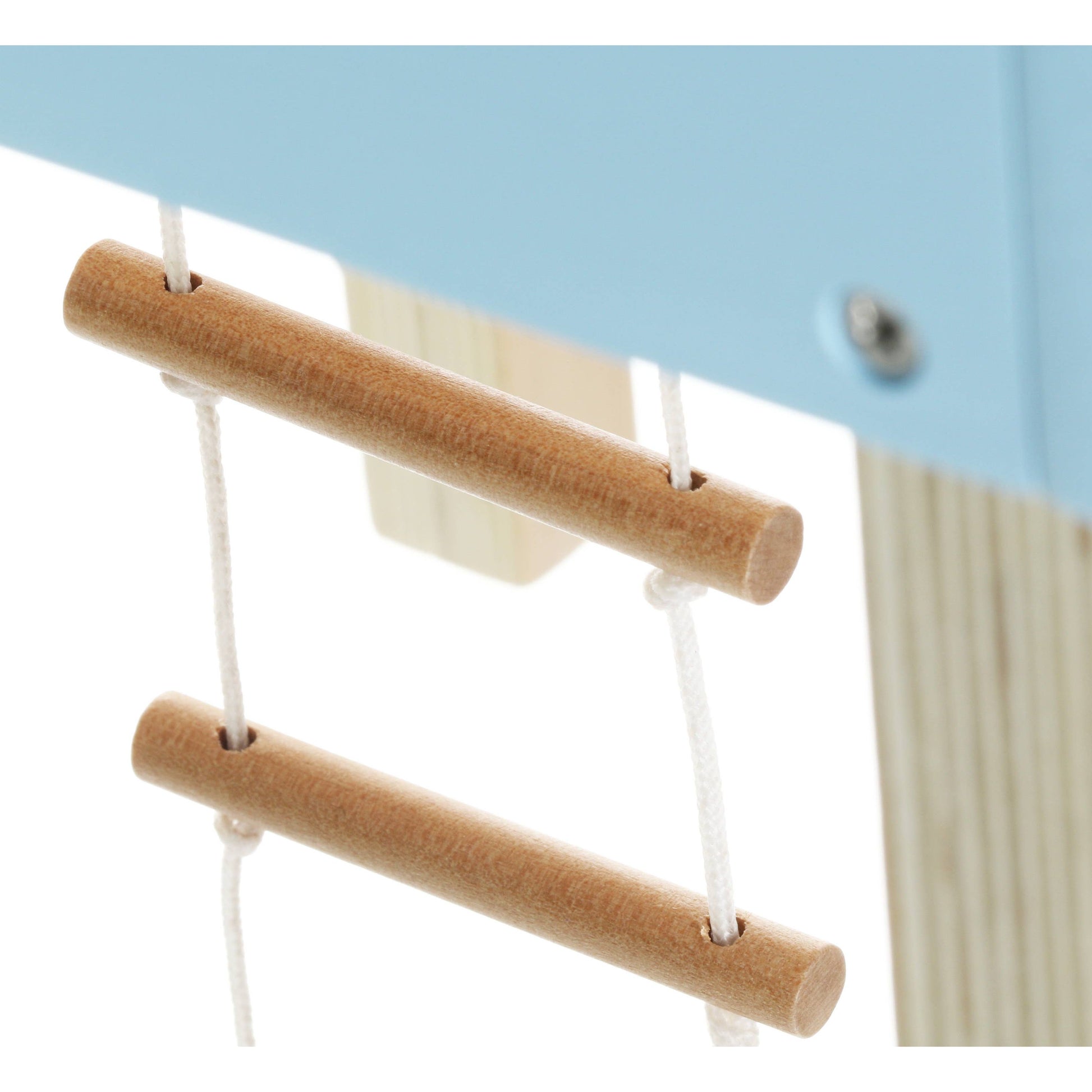 Detailed colourful wooden treehouse with swing, slide, secret trap door and ladder. With magnetic side door for easy play-time access.