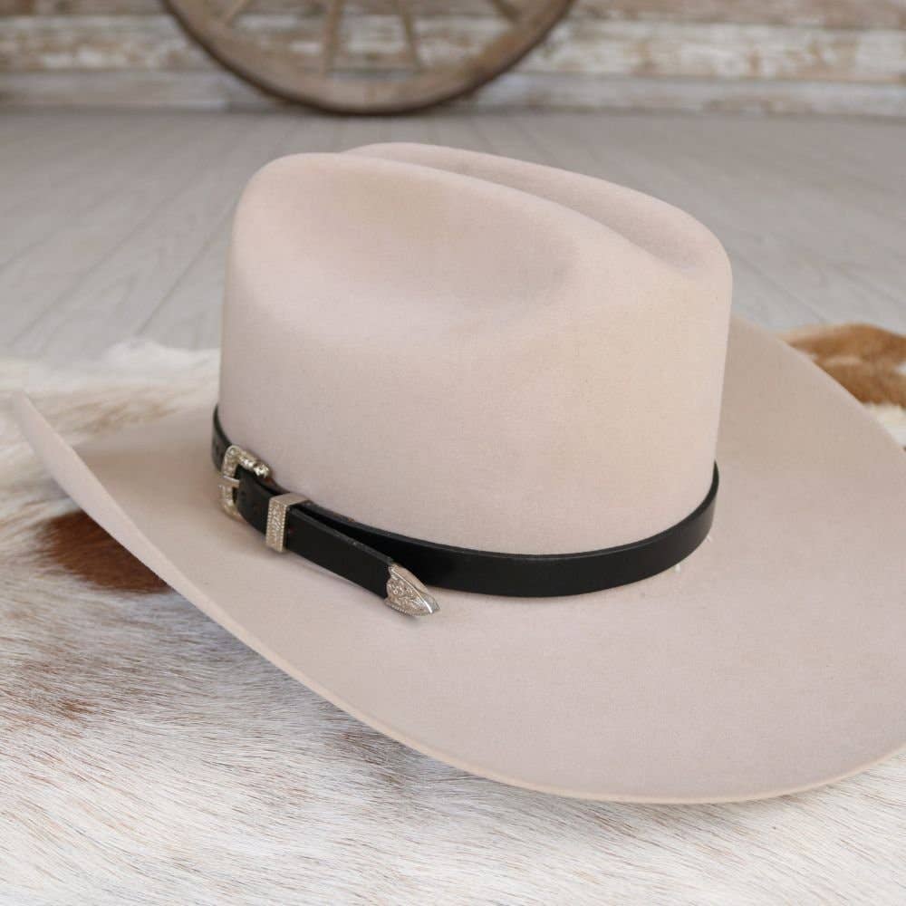 Elevate your cowboy hat with the Cash Leather Hat Band. Crafted from genuine leather, it features a silver stone buckle set for a clean, polished look. Designed for versatility, it adjusts to fit most hats up to size 7 5/8.