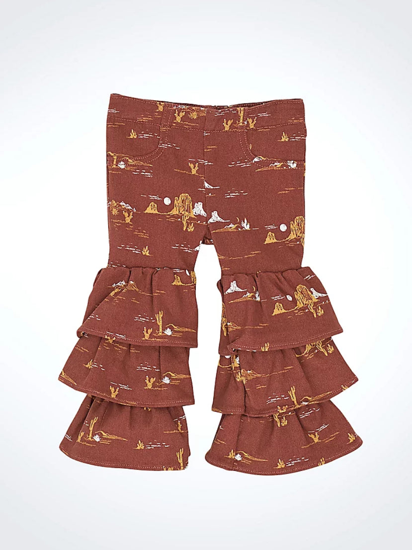 With a retro-inspired look and feel, this Little Girl’s Printed Tiered Flare Jean is made for any cowgirl who’s ready to rock the Western look. It features an easy pull-on design with an elastic waistband to provide a comfortable fit as she grows and a tiered leg full of ruffles for extra flair. It’s made of a soft cotton blend with just a little stretch for flexibility, with a print full of desert-inspired motifs to ground her outfit in true cowgirl style.