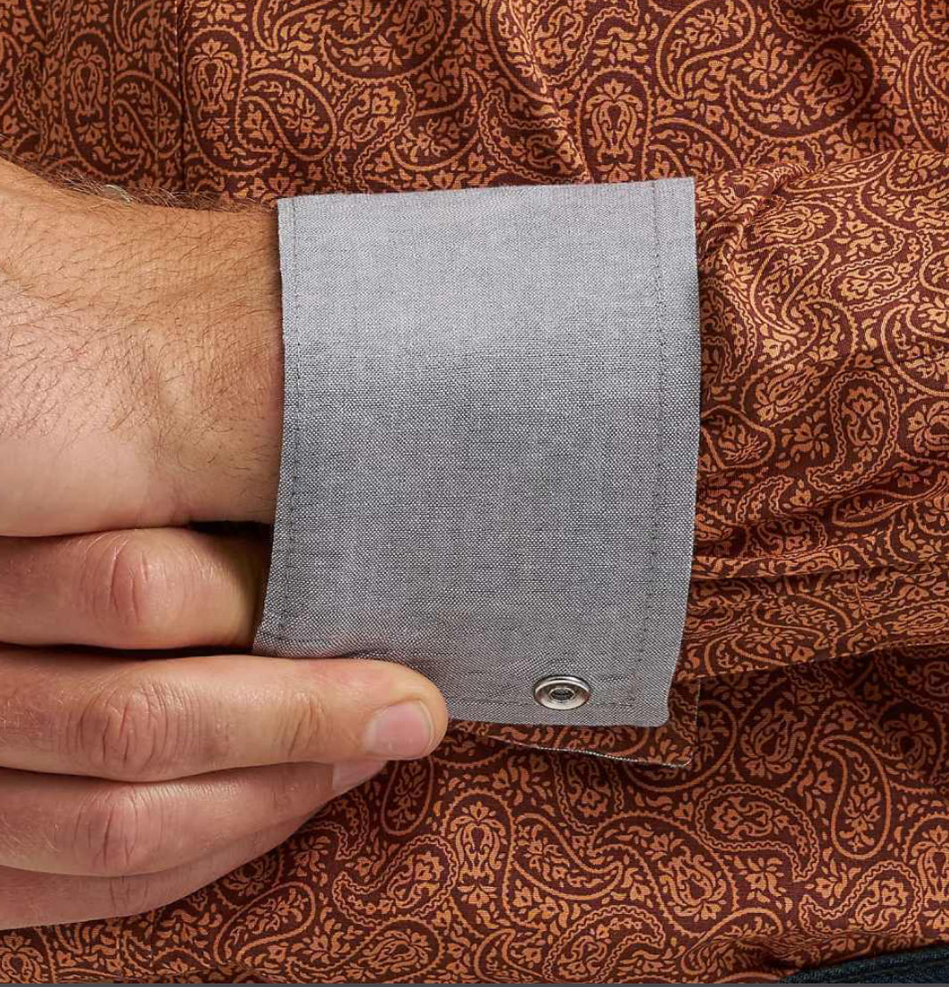 Essential Wrangler Mens 20X Comfort Western Shirt Rustic Brown Paisley. Authentic comfort and style. Combining iconic styling with a contemporary look, the Men's 20X® Competition Advanced Comfort Snap Front Shirt keeps you comfortable both in and out of the arena. This long-sleeve snap shirt features a spread collar, pointed yokes, two snap flap pockets, a full snap closure, and a classic fit. Plus, it's made of cotton and stretch for premium performance under pressure. Matching infant is 112367741. Matching boys is 112367916